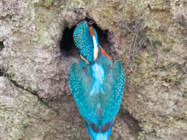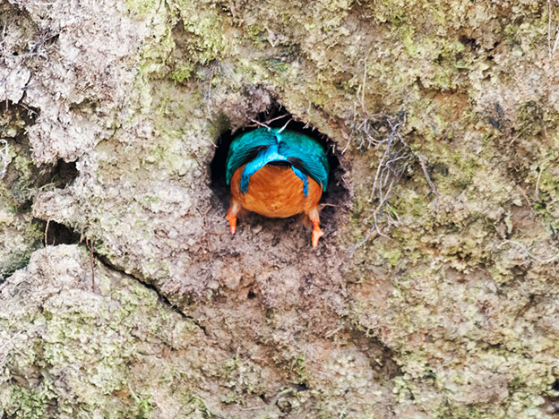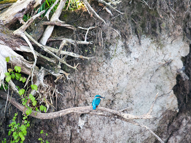 De ijsvogel maakt normaal een nest/hol in hoge oeverkanten. In de biesbosch zijn deze er echter niet daarom nestelt de ijsvogel in de biesbosch in de kluit van een omgewaaide boom. Als er jonge ijsvogeltjes in het nest zijn zal er vis gevoerd moeten worden.